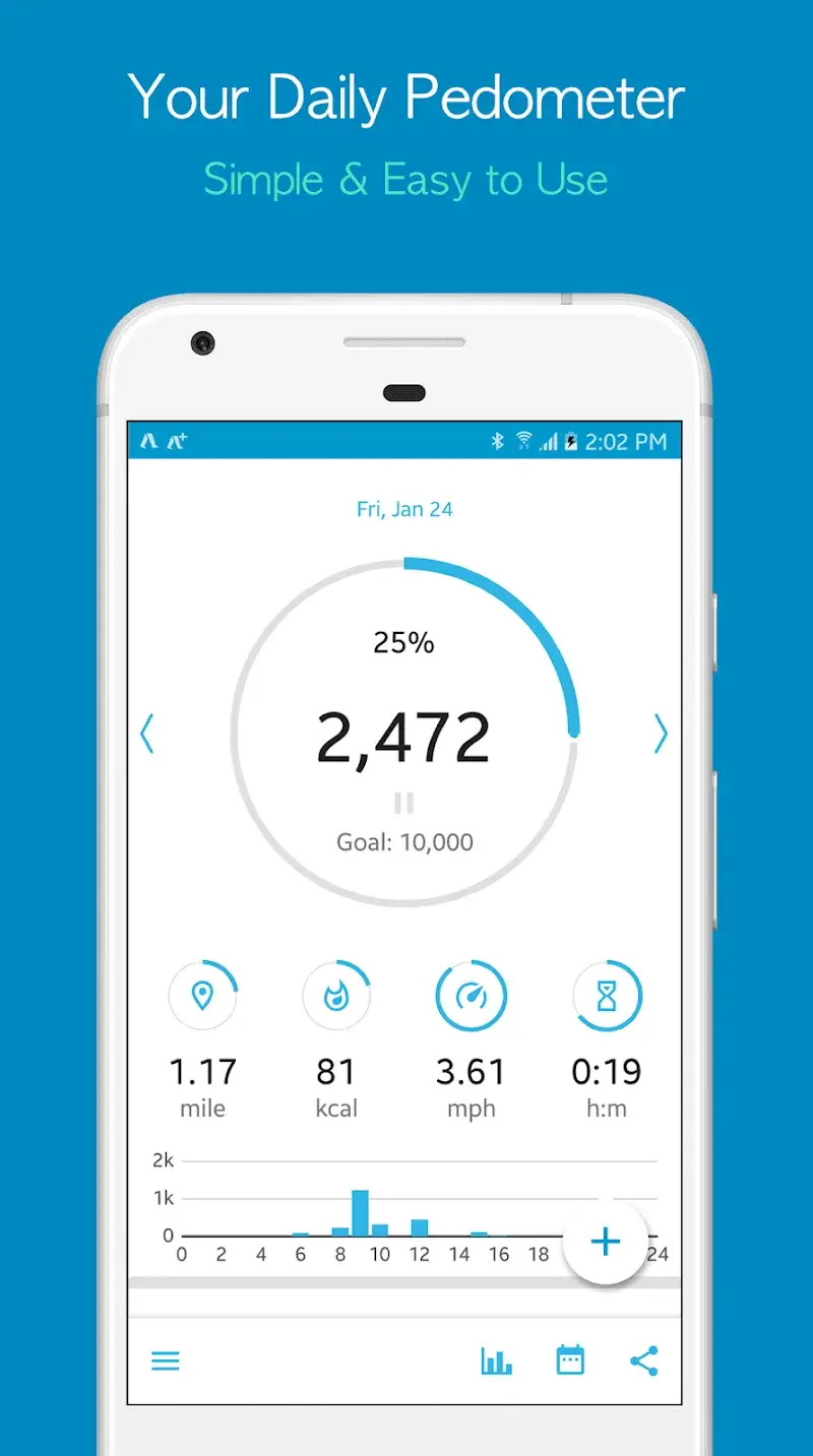 Accupedo Mod is a pedometer application that uses your device's sensors to count steps, calculate distance, and estimate calories burned. It is designed for users who want to track their daily physical activity without dedicated hardware. The app provides daily, weekly, and monthly statistics with a focus on simplicity and passive tracking.