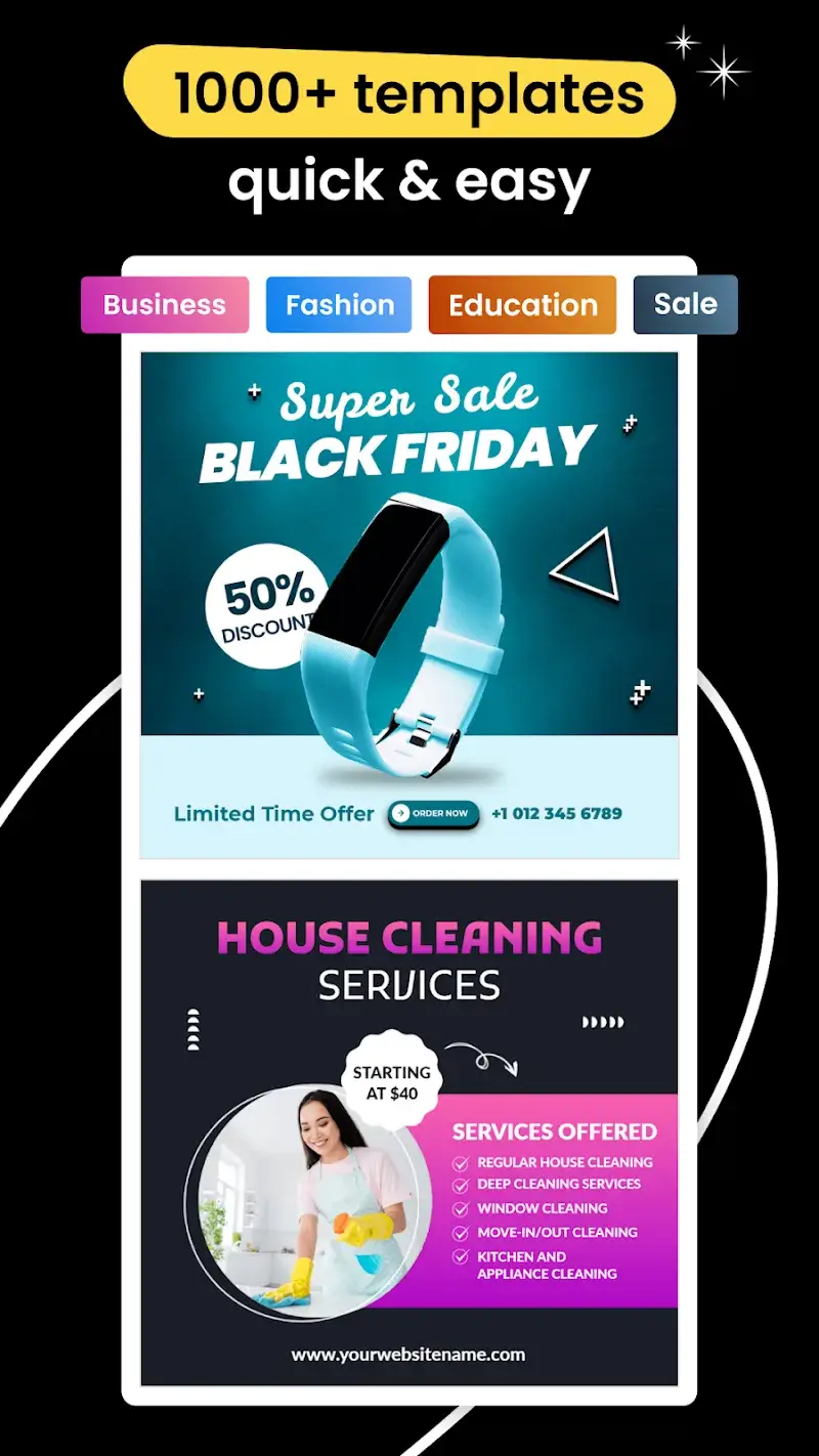 Ad Maker Mod is a graphic design application for creating advertisements, social media posts, and promotional materials. It targets small business owners, marketers, and individuals who need to produce visual content quickly without professional design software. The app functions within the business utility category, focusing on template-based editing.