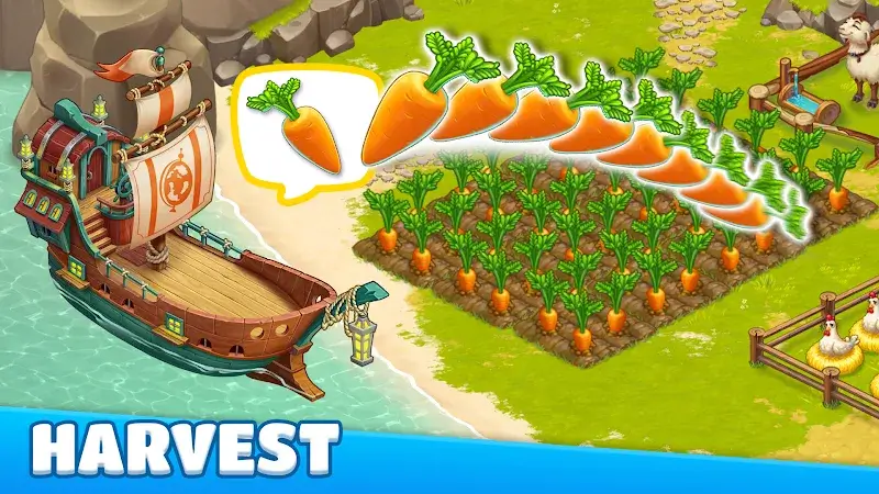Adventure Bay Mod is a 3D farm simulation and town restoration game developed by GAMEGOS. Players manage resources, cultivate land, raise animals, and explore a desert island to rebuild a ruined town alongside characters Lydia, Henry, and Jojo. The core loop involves farming, crafting, trading, and completing tasks to progress the narrative and unlock new areas. This mod APK targets players who wish to bypass the game's resource constraints and monetization barriers.