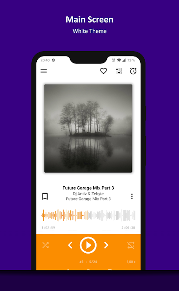 AIMP - for Android - a lightweight mobile of the music player for the platform Android. Supported formats: *.ape; *.mpga; *.mp3; *.wav; *.ogg; *.umx; *.mod; *.mo3; *.it; *.s3m; *.mtm; *.xm; *.aac; *.flac; *.mp4; *.m4a; *.m4b; *.mpc; *.wv; *.opus; *.dff; *.dsf; *.tta;