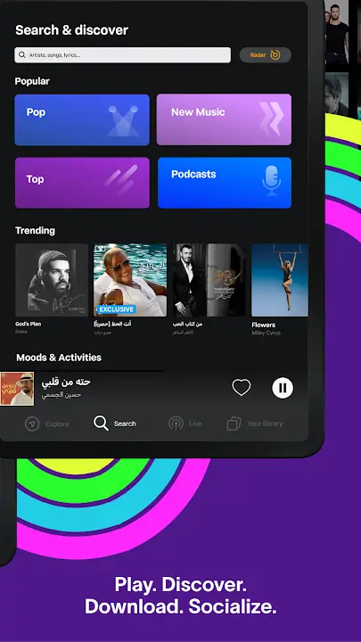 Unleash the power of music with our extraordinary platform! Immerse yourself in a vast collection of millions of captivating arabic songs, all at your fingertips, and the best part? It's absolutely free! Dive into a world of endless possibilities as you explore, stream, and download your favorite tunes. Craft personalized playlists that perfectly complement every moment of your day, and let your creativity shine as you share them with the world. But that's not all - elevate your audio experience with an incredible selection of podcasts from across the region.