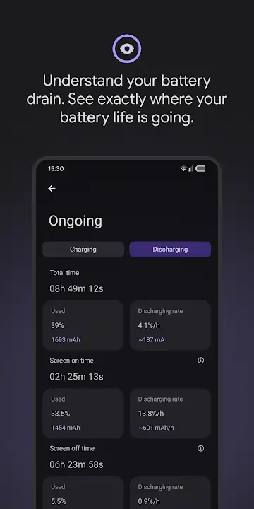 The comprehensive deployment of software. Insights concerning wake-locks have been obtained subsequent to the recent separation. It is crucial to monitor the remaining battery charge and comprehend the time necessary for it to attain a complete charge. Awareness of the battery's remaining usage time is crucial for making educated planning and decisions. Evaluations concerning the operating condition of the screen, indicating its activation or deactivation.
