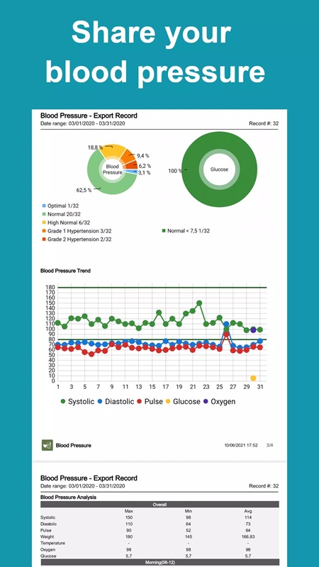 You can automatically export the report logs on Blood Pressure Tracker MOD APK in many different formats such as csv, html, Excel, PDF, to make it more convenient to share data. For example, you can export the record in Excel format for the period: March 1, 2020 – March 31, 2020, on that Excel table will display the measurement date, along with information related to ventricular BP, diastolic BP, heart rate, weight, measurement area, measurement location. Therefore, you must regularly measure blood pressure so that the application can fully record detailed information. From that data, the doctor can grasp the patient’s situation and provide better home treatment solutions. In addition, Blood Pressure Tracker MOD APK also helps you summarize blood pressure measurement data in a general analysis table for each month, making it easier for users to understand and more convenient to compare measurement parameters.