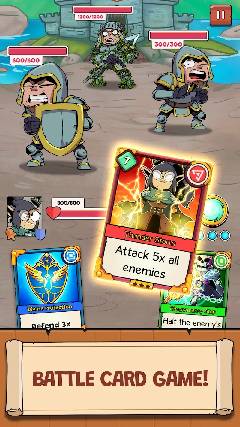 In Card Guardians: Deck Building, players will be able to unlock many types of cards with different effects. They will help you create certain advantages in gameplay, so using them correctly is also very important. Specifically, each card will have different colors corresponding to their effects, so green cards will never assist you in attacking. With each turn, you will draw a number of cards to your hand, and you will consider which cards to use to form a series of extremely powerful combos.