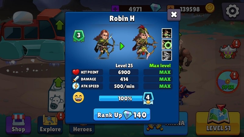 Upgrade your heroes’ transport to speed up your world exploration. Great war with monsters that emerge from where they hide. Move to new areas after defeating all bases and monster bosses. New maps will be activated after you win and complete the old map. You can also participate in the automatic journey to explore the world after gathering all three heroes. Heroes will automatically explore the map together. Unlock the arena function by training more than five heroes. Fight in the arena with other armies of heroes and find the leader of the strongest legendary squad.