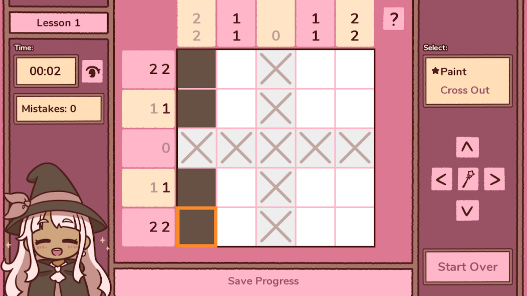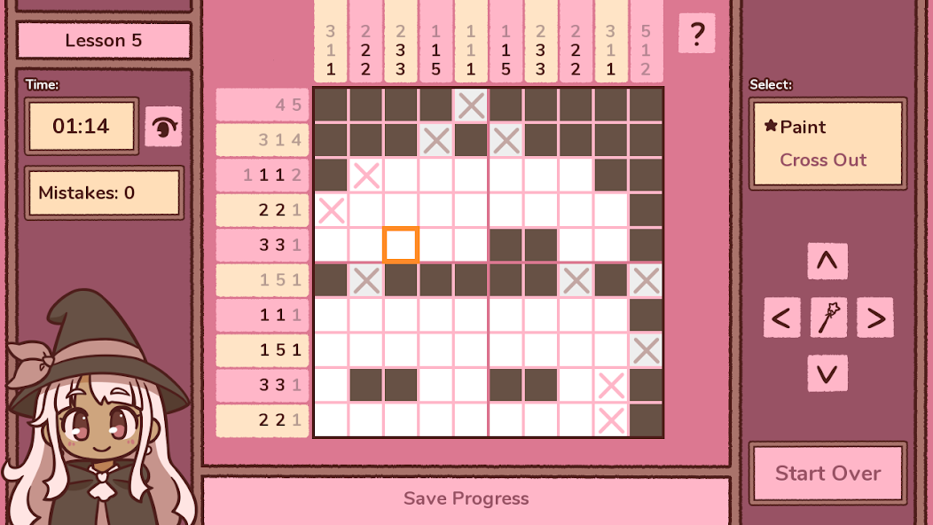 Charm Studies Mod is a puzzle game centered on solving nonograms (Japanese crosswords) within a narrative about two young witches learning magic. It targets players seeking a low-pressure, story-driven logic puzzle experience accompanied by lo-fi music. The game is designed for casual solvers, with no failure states or penalties for incorrect moves.