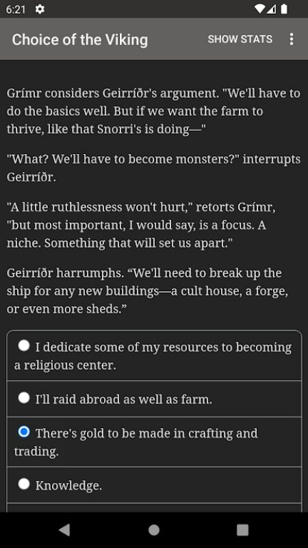 Choice of the Viking Mod is a text-based interactive fiction RPG where player decisions shape a 310,000-word historical fantasy narrative set in Viking-era Iceland. It is designed for readers who prefer narrative depth and consequential choice over graphical action. The official version monetizes through locking certain narrative branches behind premium choices and displaying advertisements.