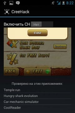 CreeHack – a utility for cracking apps and games, which present the internal cash transactions. The program allows you to make a purchase in the game store without spending real money. The main distinguishing feature – the ability to purchase game gold, diamonds, crystals, coins in many popular projects that have a donation system. In addition, the application allows you to get a free subscription (e.g., online stores). The program works in offline mode, which allows you to connect everytime to the Internet. It also does not require root-rights, updated automatically and does not occupy much space in the device memory. On the other hand, the lack of rights of the administrator limits the number of games and apps that can be hacked. Despite the straightforward design, in the settings and use utilities of every sort out. It does not require any special knowledge and skills. Using the intuitive menu, the user quickly hacked his own game. CreeHack – a great solution for those who do not want to spend extra money to purchase in-game items.