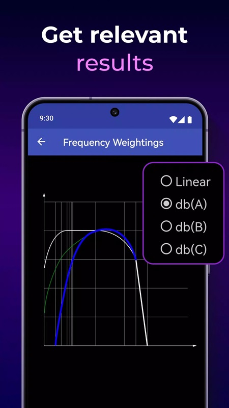 Decibel Meter MOD APK also allows users to freely choose weighted frequency modes during sound measurement, with the aim of providing accurate sound analysis results. Designed with a chart display interface, users can quickly compare the weighted curves: Linear, dB(A), dB(B) and dB(C). These are four types of international standard frequencies, commonly used in noise measurement. With dB(A), it is most commonly used because it is at the level of sound perception of the normal human ear, suitable for monitoring the impact of noise on health. As for dB(B) and dB(C), it is less used, suitable for environments with medium to high sound levels. Finally, Linear is often used when all sound frequencies are available.