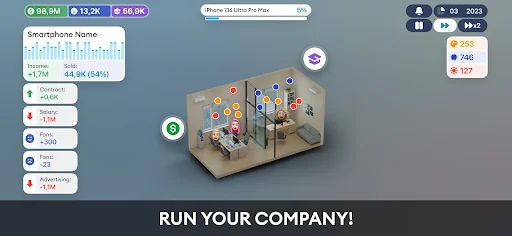 In addition to designing products, the game also allows you to build and manage your own staff. From a small company in the garage, you will need to hire more designers, hardware engineers, programmers, marketers and financial managers. Each position plays an important role and affects product quality as well as business efficiency.