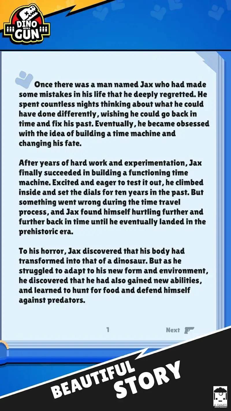Intriguing Narrative: With a smooth and beautiful interface, a compelling story that takes players through their regretful past of being transformed into a dinosaur due to a chemical experiment error. Now Jax must try to adapt to the new environment and know how to protect himself.
