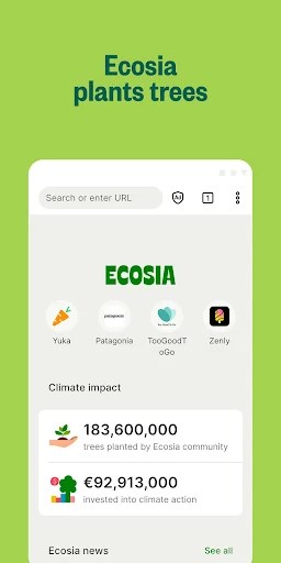 Ecosia Trees & Privacy Mod is a Chromium-based web browser and search engine that directs its advertising revenue towards global reforestation projects. The app is designed for users who prioritize environmental impact alongside standard web browsing functionality. It operates within the utility category, providing a privacy-focused alternative to mainstream browsers.