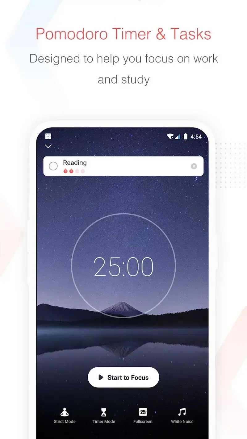 Focus To Do Mod is a Pomodoro timer integrated with a task manager. It targets users who need structured work intervals and a system for tracking to-dos, projects, and habits. The app combines time tracking with list management, syncing data across platforms.