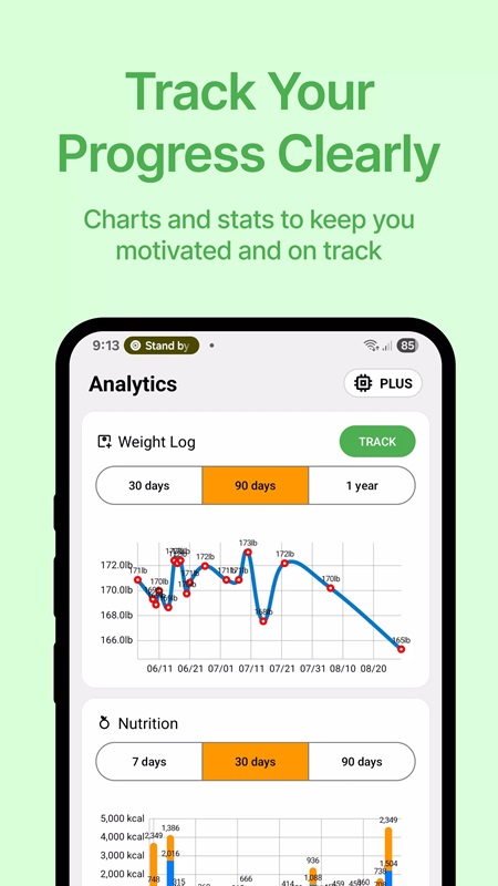 To give users more motivation to conquer the set goals, FoodSnapper AI MOD APK helps you store and track all indicators such as weight, nutrition, and static calories. All your data is displayed in detail on a line chart with accurate statistics. The system can track your weight diary within 30 days, 90 days, or a year with accurate indicators. Users only need to look at the chart to grasp the milestones of their weight changes at each specific time. Track the change in calories within seven days, 30 days, and 90 days through a column chart. Below the chart, the system has already displayed annotations such as blue static calories, gray is the calorie limit, yellow calories consumed, and red represents calories burned during exercise.