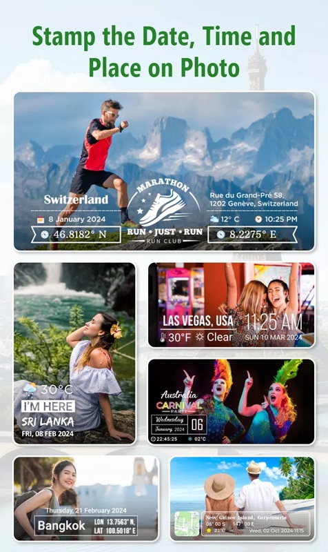 If you don’t want to spend time creating personal stamps but still want beautiful stamps that match the style of the photo, GPS Map Stamp Camera MOD APK has helped you design classy stamps. With available stamps, users just need to choose and apply them to their photos, you can also edit them to best suit. Some stamps such as: Celebration, Summer, Monsoon, Workout, Traveling… Depending on the stamp, the displayed content will be different, for example, with travel stamps, there will be weather, location, date and time, holiday stamps will be designed in a different style. Download GPS Map Stamp Camera MOD APK to easily add location and time data to photos, saving memories of the places you’ve been.