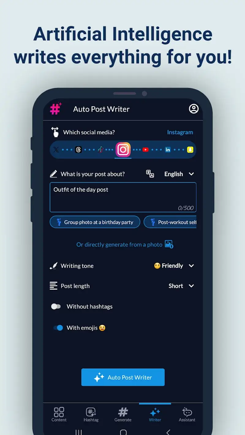 The mod features are integrated directly into the app's interface. Upon launching Hashtags AI Mod, you will have immediate access to the premium dashboard and all generation tools without any subscription prompts.