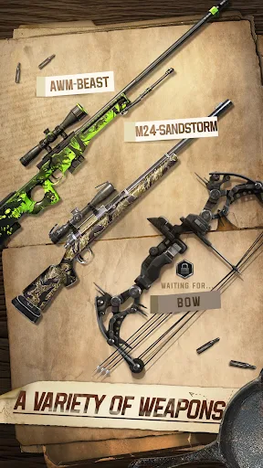 In Hunting Sniper, weapons play a decisive role in each hunt. You will start with basic guns, then gradually unlock more powerful options as you progress through each mission. The game offers dozens of different types of sniper rifles, from popular models like AWM, M24 to high-end weapons with great damage.