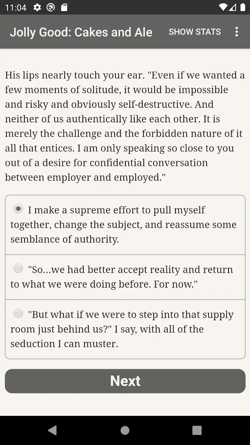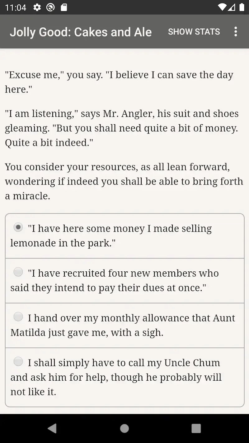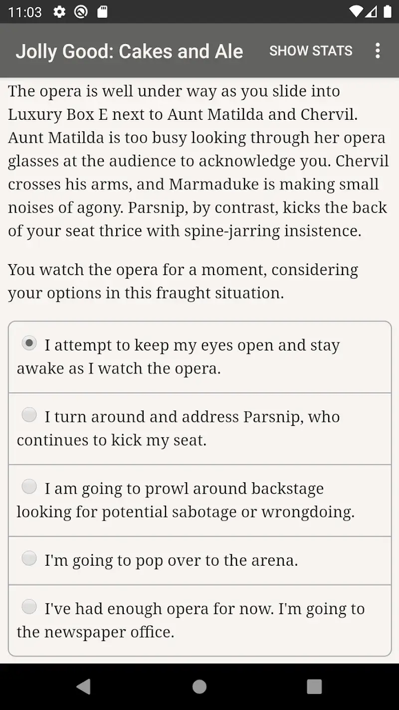 Jolly Good: Cakes and Ale is a text-based interactive novel developed by Choice of Games. It targets players who prefer narrative-driven, choice-heavy role-playing experiences over graphical action. The app presents a branching story exceeding 1.2 million words, where player decisions directly shape the protagonist's path, relationships, and the fate of their social club. The core loop involves reading narrative passages and selecting from multiple choices that influence stats, unlock new story branches, and determine outcomes.