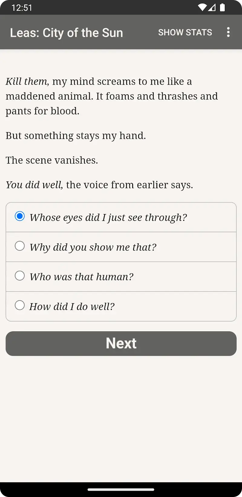 Pure Storytelling: Since there is no sound or visuals, the difficulty of the game depends entirely on the story it wants to convey.