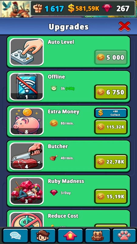 In addition to upgrading your hunter, you can also become stronger by upgrading the stats in Legends of the Arena APK 1.0.1.7. Auto Level helps your hunter to be upgraded completely automatically. Extra Money, Butcher and Ruby Madness will help the amount of gold, meat, and gems collected become more than normal. In addition, these stats can be upgraded by using a lot of gold. The higher the level, the more resources you will receive compared to lower levels. In particular, the Offline index can help your hunter fight automatically without you having to control it all the time, but this will have a time limit.