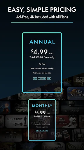 Watch continuously, anytime, anywhere, and compatible with multiple devices.Experience variety with genres like History, Nature, Science, and more.Dive deeper into history with exclusive playlists that help you understand important events and people.Make sure you stay updated with new content every week.Watch without interruptions by ads making your experience smooth.Enjoy the convenience of easily casting your favorite shows from your phone or tablet to your smart TV and other devices.If you want to become a member of this application for free, the MOD version below will be a great choice for you.