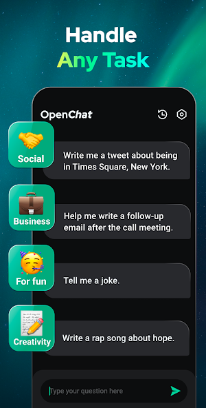 Open Chat Mod is a mobile AI assistant application that leverages GPT-based technology to answer questions, assist with creative writing, and engage in continuous dialogue. It is designed for users seeking productivity support for tasks like drafting content, generating ideas, or obtaining information without switching to a desktop interface. The app operates primarily as a local client connecting to cloud-based AI models, positioning it within the utility and productivity tool category.