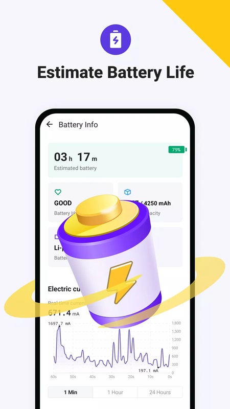 With Ora Security MOD APK, users can also easily monitor the battery status of the device accurately and in the most detailed way. During the monitoring process, the application will provide users with important indicators such as current battery level, battery health status, battery capacity, battery type. In addition, Ora Security MOD APK also displays real-time battery consumption shown in the form of a line graph. Thereby, users will see the highest and lowest battery consumption index at each time. For example, your current battery status is 79%, estimated usage time is 03 hours and 17 minutes, good battery status, battery capacity 4851/4900 mAh, Li-ion battery type, battery consumption up to 1697.7mA.
