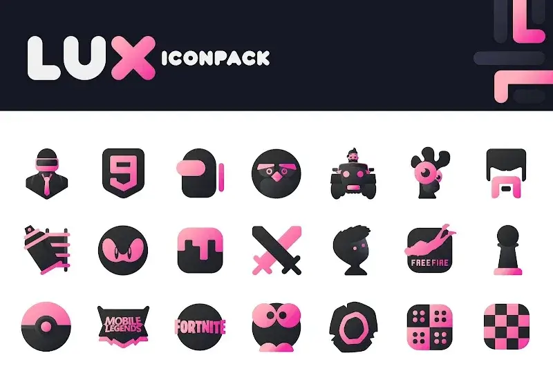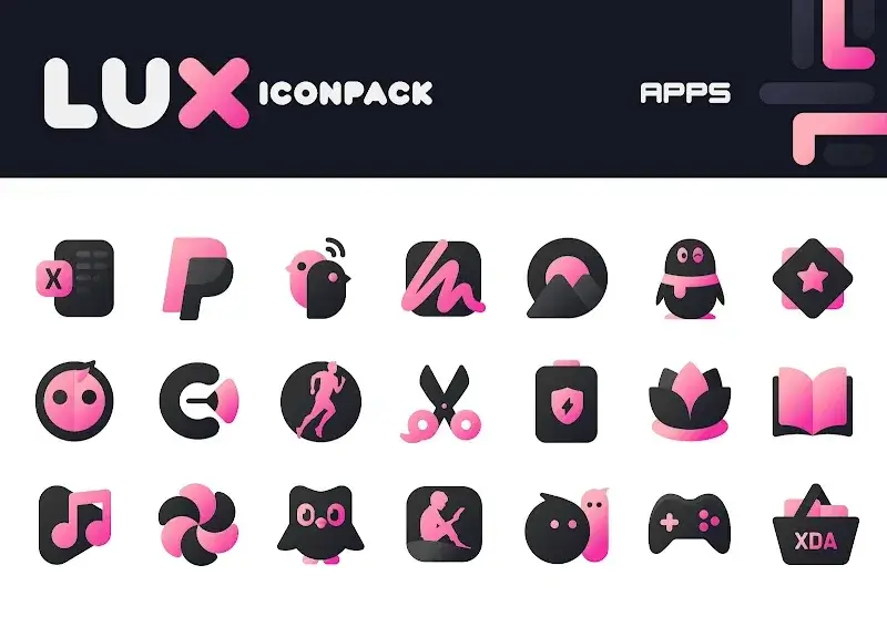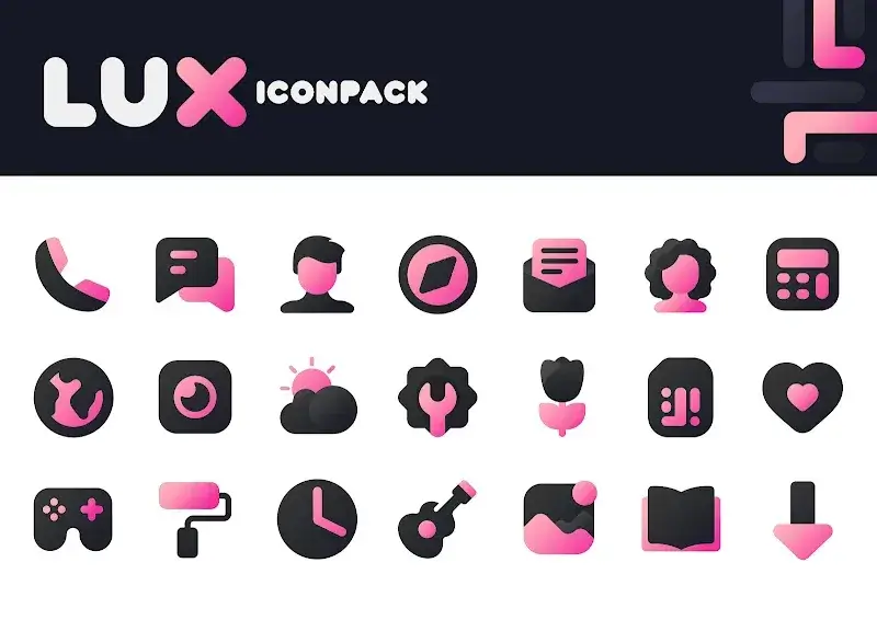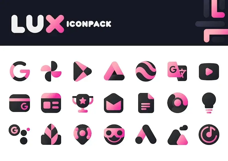 Pink IconPack LuX Mod is a third-party icon pack for Android that replaces system and app icons with a custom-designed set featuring a pink and matte black aesthetic. It targets users who customize their device's home screen using compatible third-party launchers like Nova Launcher. The app functions as a container for the icon assets and a dashboard for applying them.