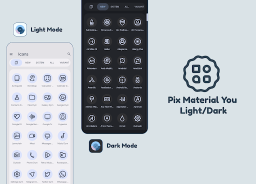 Pix Material You LightDark Mod is an icon pack application for Android launchers. It provides over 19,000 adaptive icons that automatically change color based on the system wallpaper, accent color, and light/dark theme. The app is designed for users of custom launchers like Lawnchair, Hyperion, Nova Launcher, and Niagara Launcher who want Material You dynamic theming on Android 8.0 and above. It also includes a suite of themed widgets for Android 12+ and exclusive wallpapers.