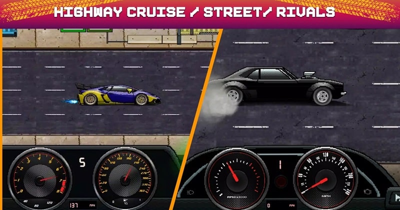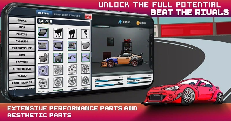 La función principal de dinero infinito se activa automáticamente al iniciar Pixel X Racer Mod. No se requiere un menú mod separado. Al realizar cualquier compra en la tienda del juego, el saldo de moneda permanece igual o aumenta.