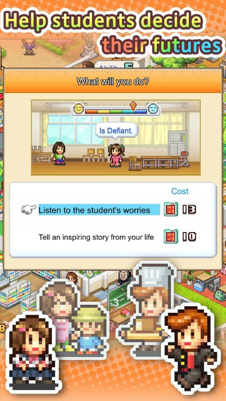 Pocket Academy 3 has a counseling room in a fixed corner. The students who come here are supported with emotional counseling, career guidance, relief, … Help students decide their uncertain future. But nothing is accessible here. There are two items for you to choose from. One is Listening to the concerns of students cost 13 books. Second, tell your inspirational story with a family of 10 books. Each student entering the room will display an emotion bar above their head. From happy to sad includes five levels with five different colors. Let’s make the emotional line go from green to red. Or is it from sad to extremely happy.