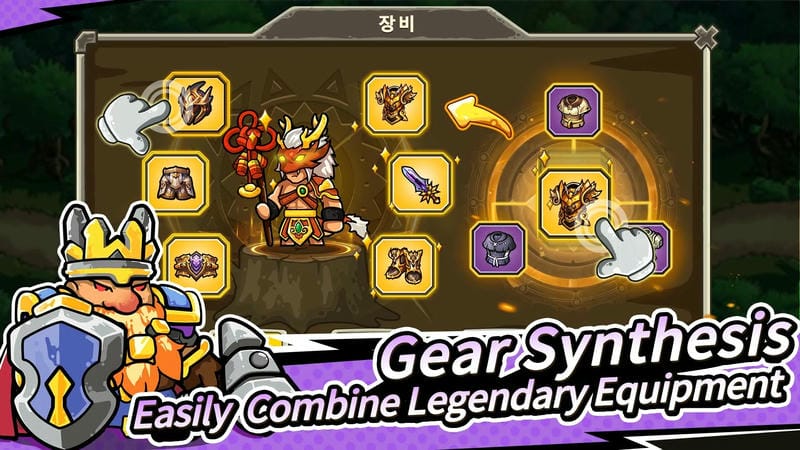 Each character will need equipment to help increase their strength in Rush defense APK mod. Heroes need up to six items to complete a set of equipment, including: helmet, body armor, belt, pants, shoes and weapons. You can get these equipment through treasure chests or lucky spins. However, these equipment are also divided into ranks by color: gray, navy blue, purple, yellow and by star numbers from one to five. You can craft high-end items by combining three items of the same rank together to create an item of a higher level. Three sets of purple-level armor combined together will create a set of gold-level armor, which makes it easy for you to get high-end items while optimizing unused items.