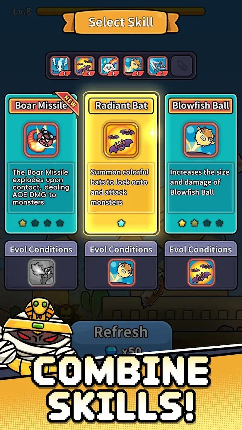 Simple dodge-attack mechanics: Players are supported to easily move in the game to avoid enemy attacks, such as left and right. The mechanism is easy to manipulate but difficult to master, which will create long-term appeal. Players are supported to easily move in the game to avoid enemy attacks, such as left and right. The mechanism is difficult to master and will create long-term appeal. Easy to learn, hard to master is allowing players to think on their feet.