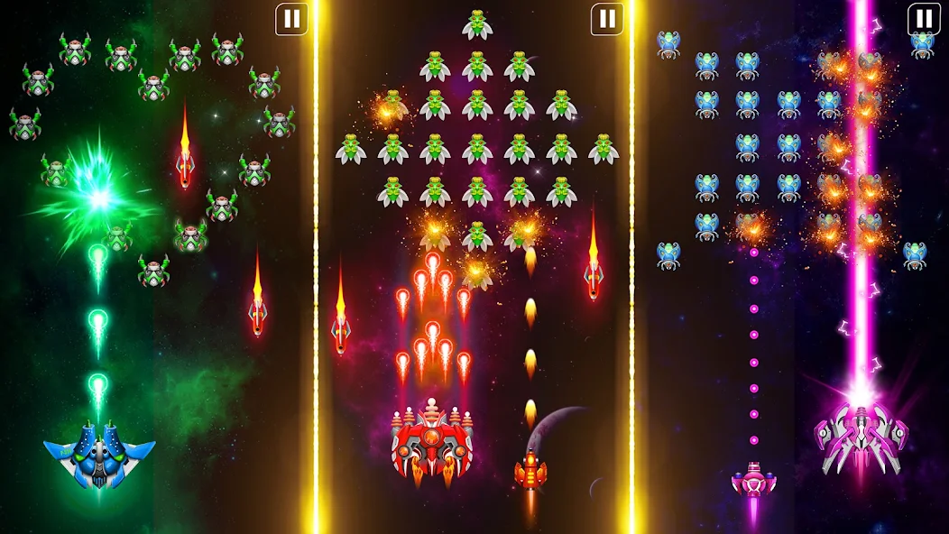 Space Shooter Mod is a vertical scrolling arcade shooter for Android. The player controls a single spacecraft through waves of insectoid enemies and boss encounters. The core loop involves surviving enemy fire, collecting in-game currency, and upgrading ship stats between levels. The mod APK targets players seeking to bypass the game's progression grind and difficulty spikes.