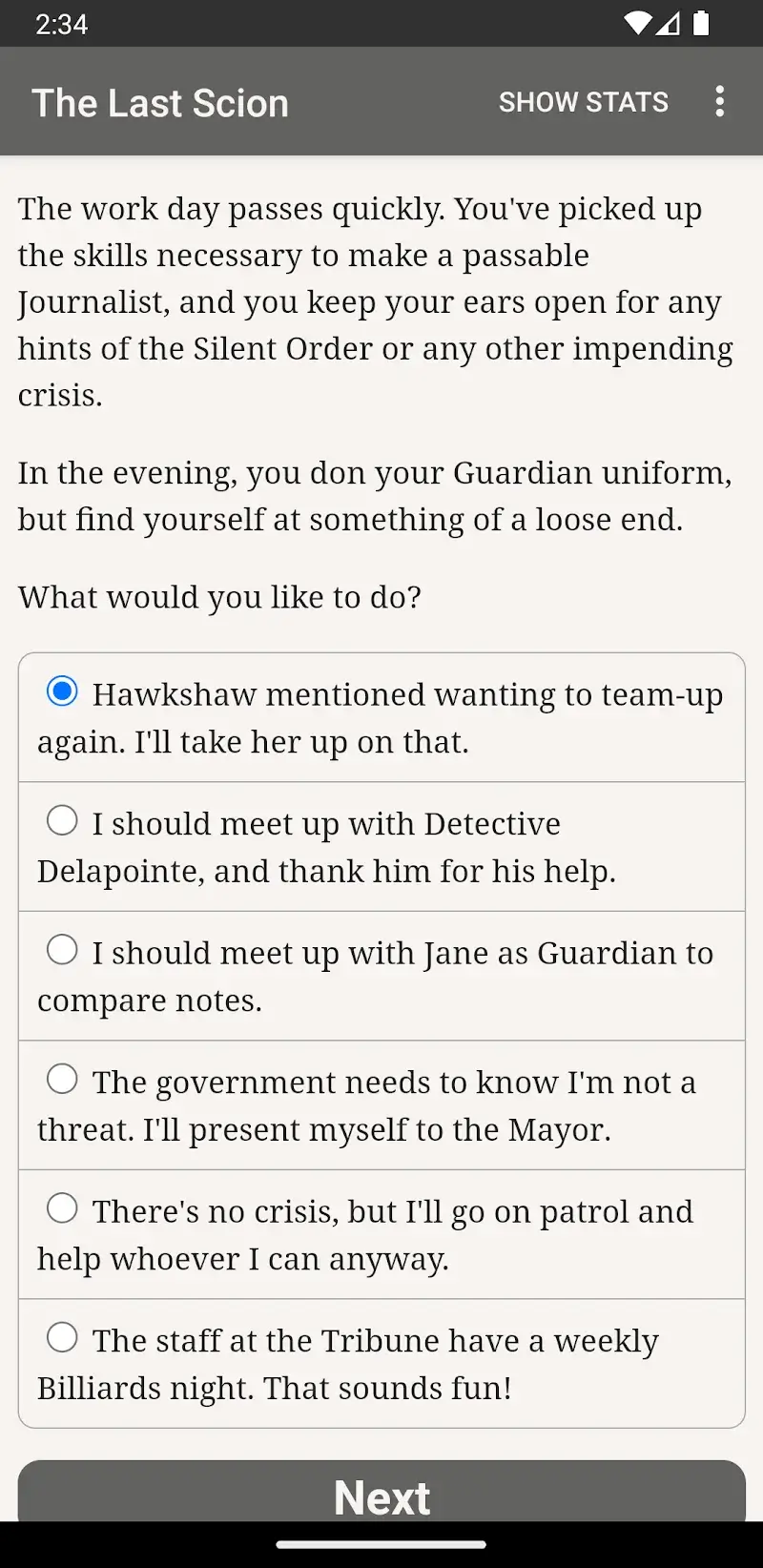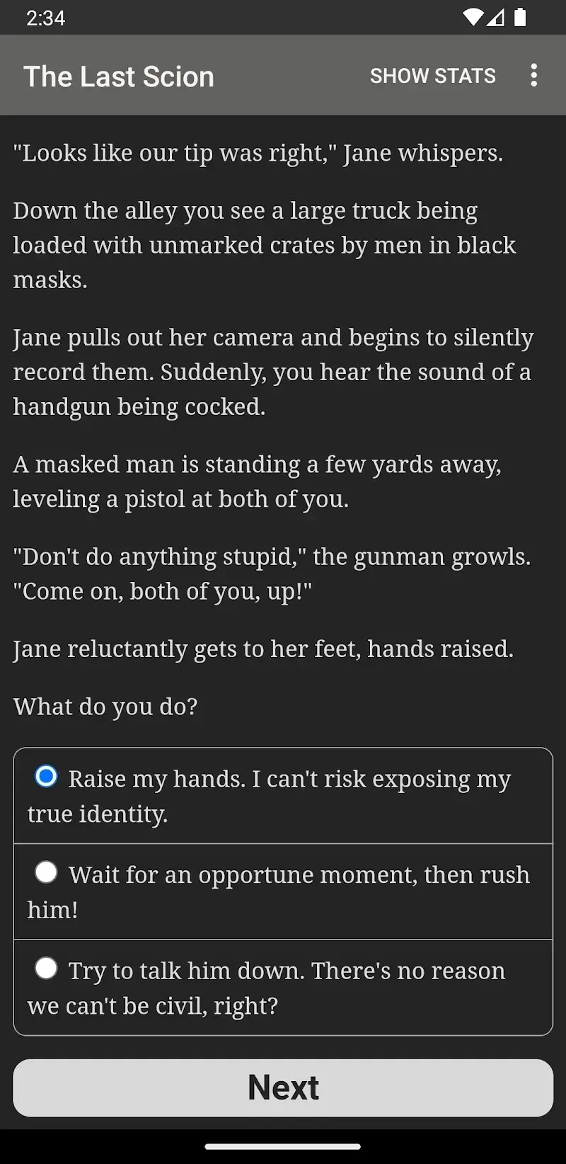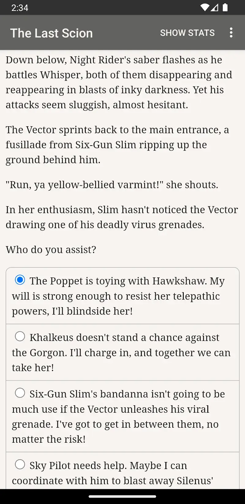 The Last Scion Mod is a text-based interactive fiction game developed by Choice of Games LLC. It places the player in the role of Scion, a powerful being from the planet Utopia, who must navigate a mission on Earth and confront the villainous Silent Order. The gameplay consists entirely of reading narrative passages and making choices that influence the story's direction, character relationships, and combat outcomes. This app is designed for players who enjoy narrative-driven, choice-based role-playing experiences without graphical action.