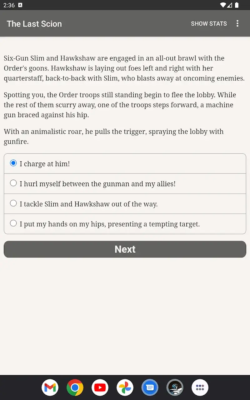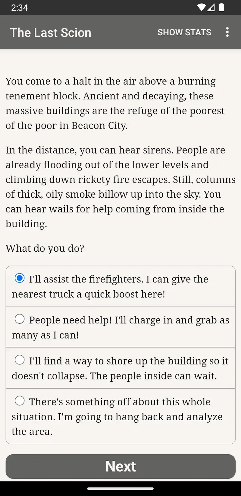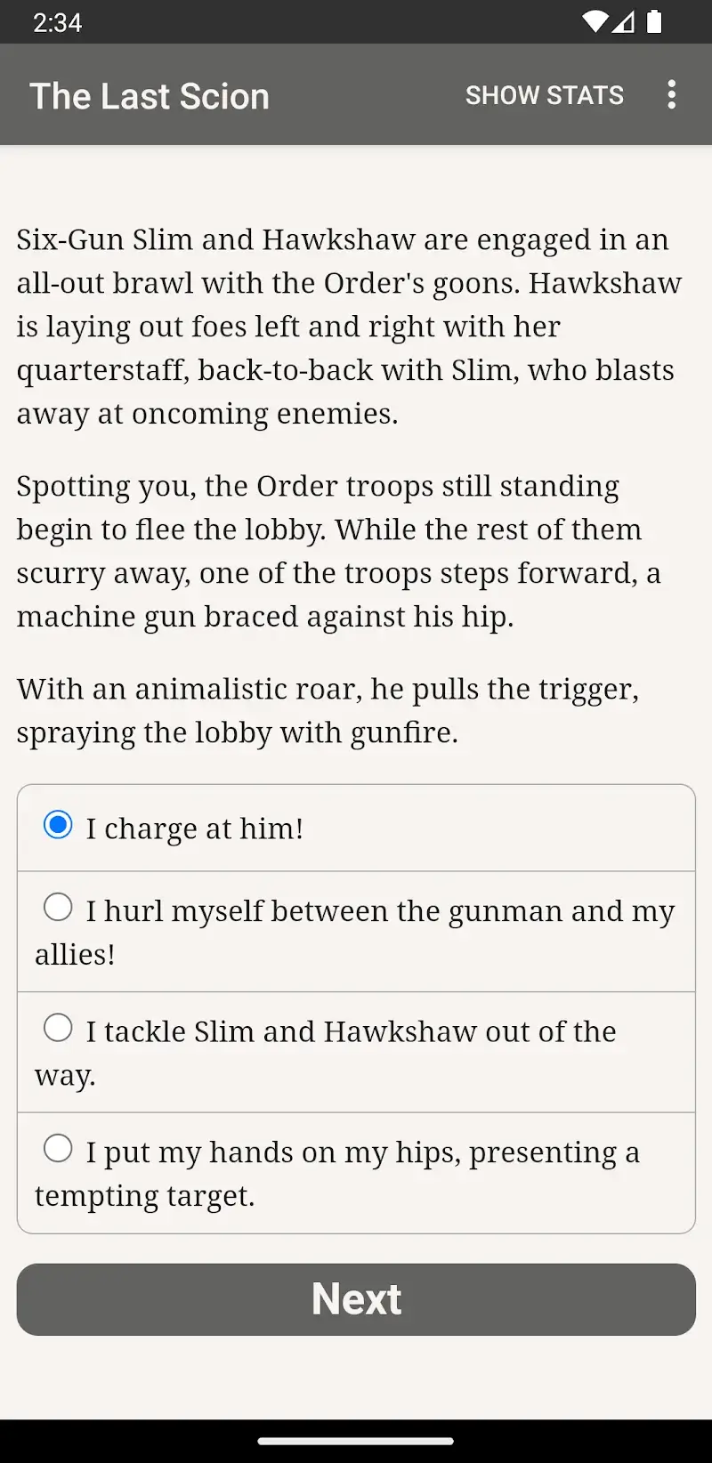 The Last Scion Mod is a text-based interactive fiction game developed by Choice of Games LLC. It places the player in the role of Scion, a powerful being from the planet Utopia, who must navigate a mission on Earth and confront the villainous Silent Order. The gameplay consists entirely of reading narrative passages and making choices that influence the story's direction, character relationships, and combat outcomes. This app is designed for players who enjoy narrative-driven, choice-based role-playing experiences without graphical action.