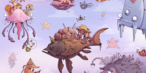 One of the most memorable images is the giant fish planet, where the story begins. On the behemoth fish’s back, miniature houses and otherworldly buildings are strewn like silent dots, constituting a world hovering in the bottomless blue horizon. As they look at every detail in the landscape, players feel as if they are inside a dream painting, where every little corner contains stories yet to be discovered.