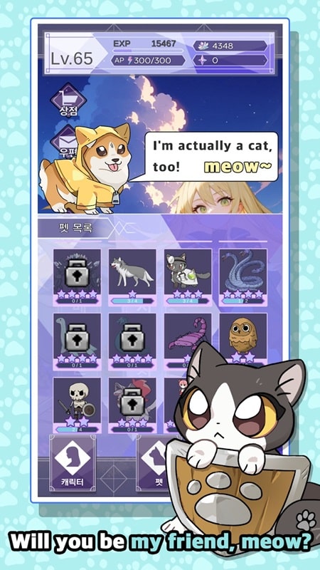 Pets are companions that you did not expect when you decided to explore Touch Meow APK. You are still fighting, destroying monsters, then pick up souls, so open and receive a cat. It begs you to capture, become your right-hand man and promises to reveal the truth about the monster force. The cat tells you that all creatures are controlled by darkness, becoming a force to guard the lands. That means you can also defeat and collect their souls to unlock new pets such as snakes, bats or squirrels. Defeat the minions sent by the enemy force to fight, tame evil creatures into your pets.