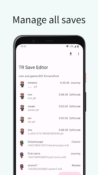 TR Save Editor Mod es una utilidad para Android que permite modificar archivos de guardado del juego Terraria. Está dirigido a jugadores que desean alterar el estado de sus personajes y mundos fuera de los límites del juego oficial, como ajustar estadísticas, inventarios y parámetros del mundo. La aplicación funciona localmente, cargando y editando los archivos .PLR y .WLD del juego.
