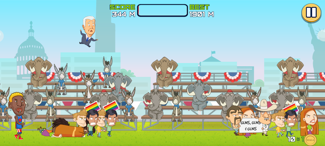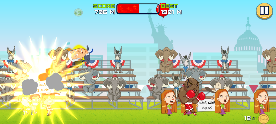 Trumped - Throw the Trump - In the midst of the election turmoil, you can now become part of the campaign to bring Murica back to its former glory. In this unique game, you will be immersed in a world of political intrigue, action and unexpected twists. Your mission is to collect votes, mobilize Trump supporters and simultaneously repel attacks from protesters. You will see Trump in the most unusual images: from a bunny suit to a freedom rocket pilot. Support the American Eagle, try your luck fishing with Sarah or test your skills in sparring with Mike. This game is the perfect way for representatives of both parties to take a break from the intense campaign. Throw, toss and send your favorite - or perhaps least favorite - candidate into the air.