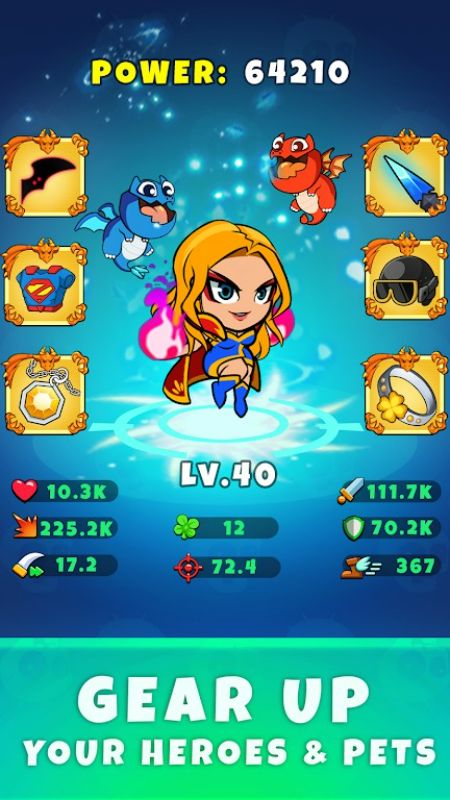 The growing zombies require players to also develop to new heights. In addition to training the operations and skills, players should upgrade the equipment for the hero. From weapons, costumes, shoes, hats to jewelry such as necklaces and rings, … Stats such as strength, health, and experience… are synthesized through indicators. Number of equipment on the hero. As the blonde superhero at level 40 has a combat strength of up to 64210, health is 10.3k, movement speed is up to 367. In addition, companion pets are also tasked with healing heroes when needed. . The number of healings is also limited per pet.