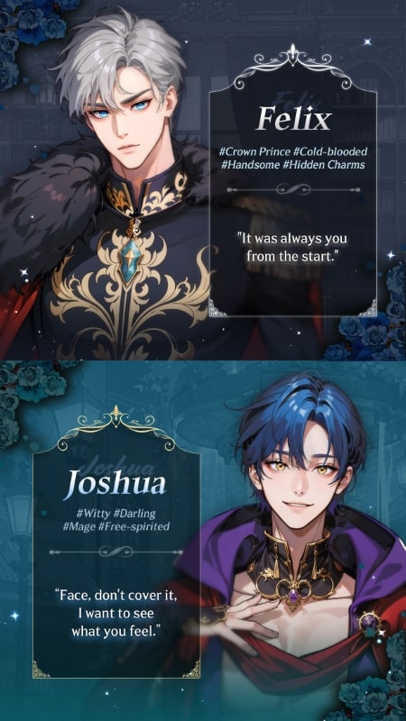 A guy named Felix has surprised you about his background, he is a cold-blooded and majestic prince. The strange thing is that you have been attracted by this appearance and got caught up in a series of difficult-to-deal-with dangers. Coldness is his strong point and it creates an irresistible charm. UNHOLIC SYNDROME APK also has a high-ranking priest and this guy will be your next challenge. Havier always wants you to be his subordinate and his calm appearance is admirable. You also cannot know if he will help you break the curse or increase other desires. It seems that he wants to pull you into his warm embrace. Joshua is indispensable, a somewhat mischievous magician and brings a difference in personality. He often teases and is unusually affectionate. You are also immersed in the illusions created by the hands of a talented magician. As a tough knight, Hugo is always quiet and respectful of your decisions. A quiet but strong person in every action and creates safety for you. This knight is good at hiding his feelings and this may be the key to help you escape the curse.