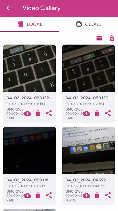 After completing the recording process in Vigil MOD APK, your videos will be stored in the video library with two main areas: Local and Cloud, so that users can easily manage and review, share videos when needed. Each video after being successfully saved will display detailed information such as file name, recording time, resolution and capacity. For example, a video was recorded at 05:01:25 PM on February 4, 2024 with a capacity of 7MB. In addition, to avoid losing videos, users can store them in the cloud, not only that you can share those videos with friends through social networking platforms.