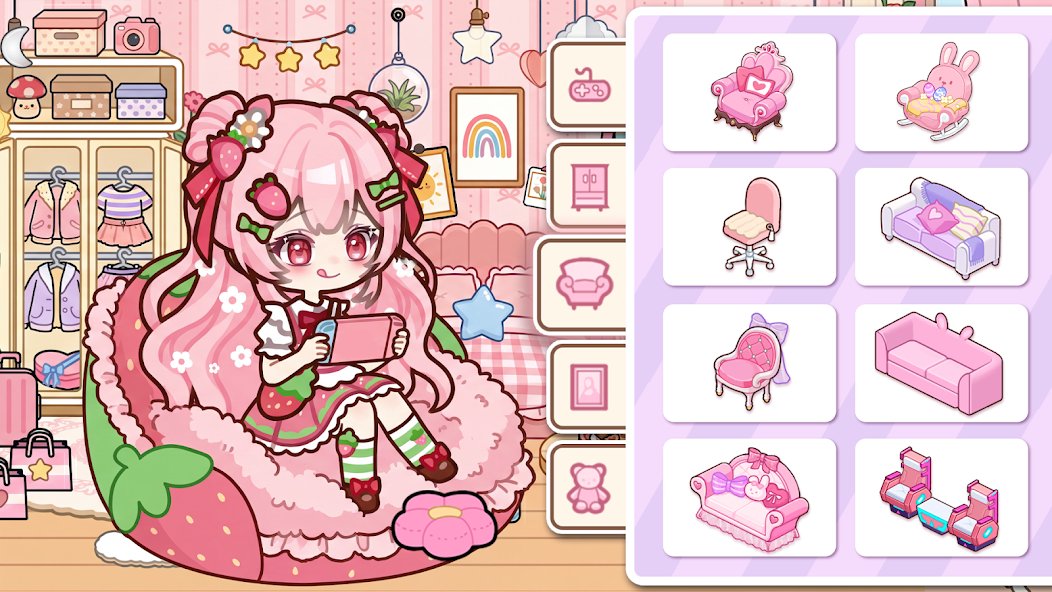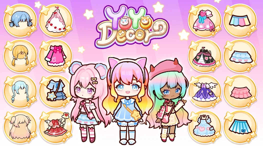 YOYO Decor Mod is a doll dress-up and home decoration simulation game. It targets users interested in interior design and fashion styling within a virtual dollhouse environment. The core loop involves selecting dolls, dressing them, and decorating themed rooms with furniture and accessories.